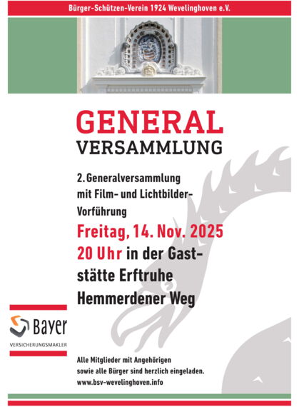 Die Mitglieder des Bürger-Schützen-Vereins Wevelinghoven treffen sich am Freitag, dem 14. November 2025 zur 2. Generalversammlung, der Jahreschlussversammlung für das Jahr 2025.