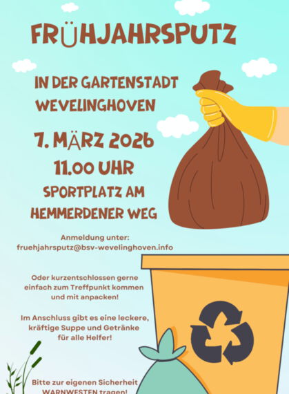 ....und dieses Motto sollte selbstverständlich sein! Darum lädt der Bürger-Schützen-Verein Wevelinghoven am 07. März 2026 erneut zum großen Frühjahrsputz in der Gartenstadt ein.